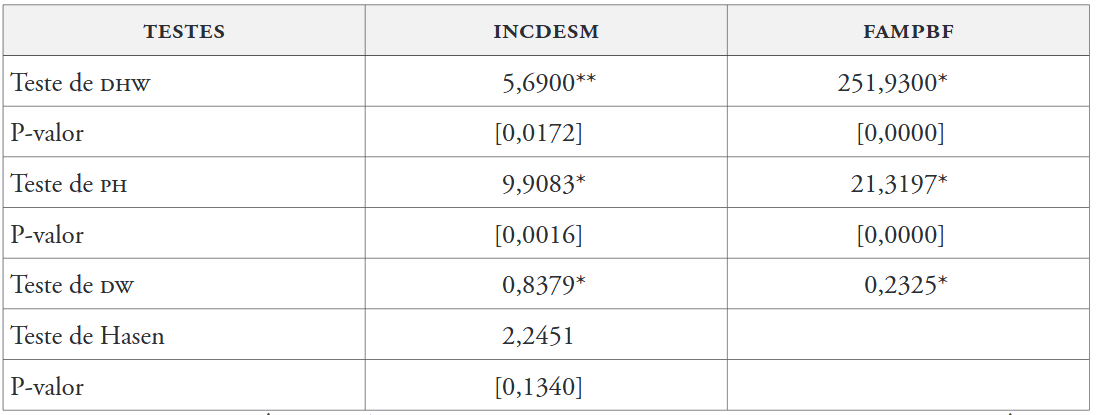 Uma etapa importante no tratamento de dados em painel é verificar a correta especificação do modelo, o que foi feito por meio de diversos testes: endogeneidade de Durbin (1954) e Wu-Hausman (Wu, 1974; Hausman, 1978), heterocedasticidade de Pagan e Hall (1983), autocorrelação de Durbin-Watson (Durbin & Watson, 1950), superidentificação de Hansen (1982) e testes de restrição propostos por Gujarati (2003) e Davidson e MacKinnon (1993).