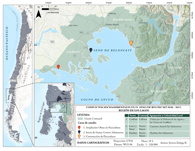 La investigación toma como área de estudio al sistema socioecológico del seno de Reloncaví y sus inmediaciones, Región de Los Lagos (Figura 1). Es en este lugar donde se desarrollan los tres casos de conflictos socioambientales analizados en la investigación, los cuales comparten algunas situaciones de origen y estrategias de acción, pero también otras características que los diferencian.