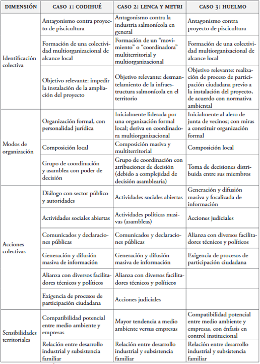 Los casos analizados (Tabla 3) tienen a la salmonicultura como eje conflictivo que genera un clima de malestar compartido (Collins, 2009), incentivando la autoorganización colectiva entre vecinos que se ven directamente afectados por estas empresas.