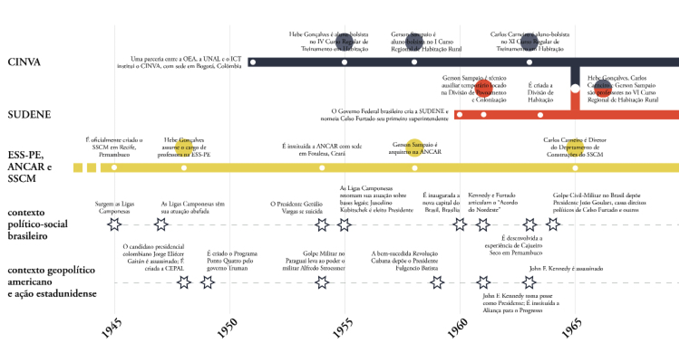 Na primeira parte deste trabalho, apresenta-se um panorama histórico contextual que insere cada uma das instituições – com origens e trajetórias particulares entre si – em uma conjuntura política, econômica e social própria, embora com bases compartilhadas a nível continental. Sua aproximação é materializada pelas trajetórias de três atores brasileiros específicos, analisadas na segunda parte do trabalho: a assistente social Hebe Gonçalves, o engenheiro civil Carlos Carneiro e o arquiteto Gerson Sampaio. Com base na construção histórica realizada, postula-se que a circulação transnacional desses profissionais contribuiu para a introdução e consolidação da temática habitacional na pauta da SUDENE, no contexto da difusão de ideias e saberes pelo continente. Na terceira e última parte do trabalho, encerra-se o panorama histórico construído, apresentando as conclusões gerais do trabalho e pautando reflexões para o campo historiográfico.