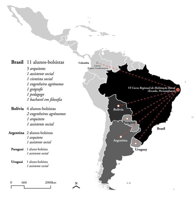 A origem nacional e a formação acadêmica dos alunos-bolsistas matriculados no curso evidenciam a extensão e complexidade das redes latino-americanas de difusão de ideias e saberes em planejamento territorial e programação habitacional. Serão os próprios professores brasileiros, egressos do CINVA e atravessados por aportes particulares acumulados ao longo de suas trajetórias individuais, que difundirão seus saberes e ideias para alunos argentinos, bolivianos, paraguaios, uruguaios e, também, brasileiros. O corpo discente apresentava um perfil multidisciplinar, compreendendo arquitetos, assistentes sociais, cientistas sociais, engenheiros agrônomos, geógrafos, pedagogos e outros (CINVA & SUDENE, 1966). Dessa forma, consolidou-se um ciclo de difusão do conhecimento que colaborou para a cristalização das redes latino-americanas dos campos e a projeção de suas ideias e saberes (Figura 6).