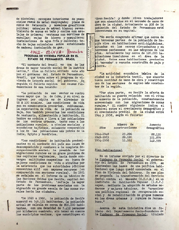 A partir desse esforço didático dos dois alunos-bolsistas, algumas considerações críticas emergem. Observa-se, primeiramente, a transposição da metodologia experimental em planejamento territorial e programação habitacional do CINVA para uma realidade socioespacial distinta da colombiana e de seus territórios periurbanos – chegando a indicar a adoção de processos construtivos atualizados tecnologicamente pela instituição interamericana para a realidade brasileira, como a fabricação de blocos de solo-cimento com a utilização das máquinas CINVA-RAM.5 Leão e Casaretto não tomam o território latino-americano como um todo homogêneo, reconhecendo antes o conjunto de estruturas constitutivas compartilhadas entre seus países, refletidas nos padrões de ocupação e significação de seus territórios – o que permitiria, então, a adoção de estratégias similares para o desenvolvimento local. Uma segunda reflexão crítica pode ser tecida a partir da caracterização de Dois Unidos, situada em um território periurbano do município de Recife, como uma “comunidade rural-urbana”. Esse conceito aparece mais bem sintetizado no próprio neologismo “rurbano”, originalmente cunhado em inglês por Sorokin, Zimmerman e Galpin em 1930 e traduzido para o português pelo intelectual pernambucano Gilberto Freyre: a “conjugação entre os modos de vida rural e urbano”, resultado da aproximação dos valores de cada uma das duas situações originais na constituição de uma terceira categoria autônoma (Freyre, 1982, como citado por Souza, 2009, p. 182). Não é coincidência a presença de Freyre nessa cena: ainda na primeira metade do século XX, ele já demonstrava especial interesse pelas transformações socioespaciais observadas em seu estado, que passaria da Casa-grande e senzala (1933) aos Sobrados e mucambos (1936). Em 1949, Freyre fundou o Instituto Joaquim Nabuco de Pesquisas Sociais (IJNPS), voltado ao estudo socioeconômico do homem e das condições de vida no Nordeste. Nele foram produzidas investigações pioneiras sobre as condições da vida rural em Pernambuco, difundidas em publicações sobre a ordem fundiária, as dinâmicas migratórias campo-cidade e as características habitacionais regionais (Leonard, 1960; Melo, 1961).