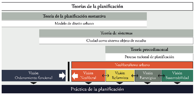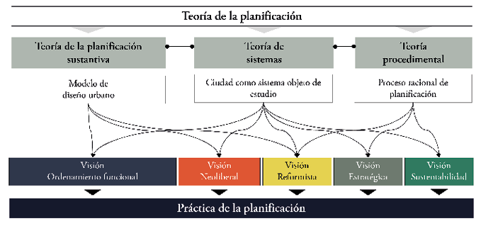 La propuesta de las diferentes visiones de la práctica que se han expuesto ha tenido influencia de las diversas teorías de la planificación, caracterizándose un hibridismo teórico en ellas que orienta, en particular, los procedimientos técnico-normativos y participativos en la formulación de instrumentos (Figura 2).