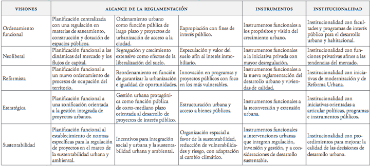 Las visiones propuestas referencian claramente una acción pública abocada inicialmente a la urbanización desde la lógica de un ordenamiento funcional, con fuerte liderazgo estatal, que se interrumpe por la imposición de la hegemonía del mercado, el protagonismo de la acción privada y el cambio del rol del Estado con una gobernanza urbana bajo criterios empresariales (Harvey, 1977; Hidalgo & Janoschka, 2014). A partir de lo anterior, se evidencia una transición de visiones conforme a una serie de adecuaciones reglamentarias sobre el alcance de la planificación como función pública con foco en la regulación, y manteniendo de esta manera su sesgo neoliberal. El cruce de aspectos que caracterizan las visiones más recientes muestra la relevancia de los procedimientos reglamentados para sustentar los procesos de decisión en cada contexto, en especial en la gestión estratégica, la inversión y los incentivos en la regulación urbana, todo lo que ampara las diferentes actuaciones público-privadas en materia de desarrollo urbano.