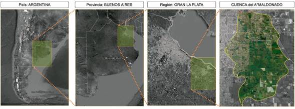 En este contexto territorial, la cuenca del Arroyo Maldonado se localiza en la zona sudeste del partido de La Plata y se extiende al Partido de Berisso (provincia de Buenos Aires). Abarca aproximadamente 3800 hectáreas, y contiene una población estimada de 67.406 habitantes (Figura 2).