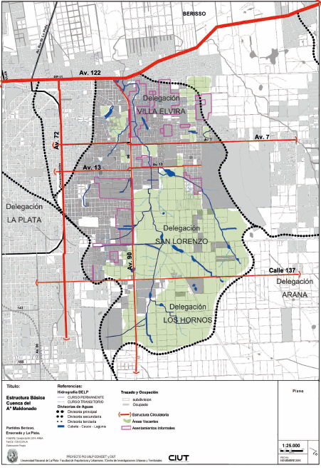 Longitudinalmente a la cuenca, existen sectores de ocupación con asentamientos precarios a lo largo de la Av. 90, y en algunas áreas se ocupan las márgenes del arroyo, generando situaciones de riesgo hídrico debido a la disminución de la capacidad absorbente de los terrenos.