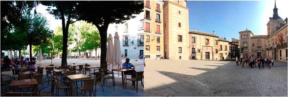 A modo de ejemplo, en la Figura 2, se muestra fotografías utilizadas como estímulos en el cuestionario de la Plaza de la Villa y la Plaza de la Paja, los dos zocos extramuros del Madrid medieval del siglo X. Tal y como se puede apreciar, aunque ambas plazas tienen una alta presencia de patrimonio edificado, elementos de la escena urbana -la presencia de árboles, terrazas, la intensidad de uso, etc.- así como el tipo de actividad urbana, sugieren que la percepción del patrimonio se ve modificada como variable explicativa de la dimensión estética. De ahí que resulte relevante conocer, en términos de significación estadística, la interacción de otros elementos de la escena en la percepción del patrimonio edificado.