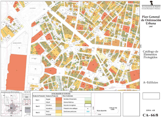 1. Presencia de patrimonio edificado: ponderación del nivel de protección, conforme al Catálogo de Elementos Protegidos del Plan General de Ordenación Urbana de Madrid (PGOU) de 1997 (Figura 4), de cada elemento arquitectónico que conforma la plaza en función de su huella sobre el borde edificado[10]. La ponderación corresponde a una escala de 0 a 6, siendo 0 presencia nula de patrimonio y 6, máxima presencia de patrimonio.