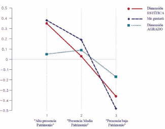 Finalmente, en la Figura 5, se exponen los perfiles de las percepciones medias recogidas en los cuestionarios respecto a los tres ítems, para cada grupo de plaza en función de la “presencia de patrimonio”. Se aprecia de nuevo que, tanto la dimensión estética como la voluntad de uso media de la plaza, adquieren valores positivos altos para el grupo “Plazas con alta presencia de patrimonio” y negativos para el grupo “Plazas con baja presencia de patrimonio”. Para el grupo “Plazas con presencia media de patrimonio” la percepción “estética” adquiere valores medios cercanos al valor neutro. Se observa también que la dimensión “agrado”, aún correlacionándose con las otras dos dimensiones (ver Tabla 2), no guarda una correspondencia tan evidente con ellas en el gráfico.