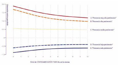Finalmente, se elabora un gráfico (Figura 6) con la variable que más influencia ejerce en términos estadísticos sobre el patrimonio en la percepción estética (eje de ordenadas), la contaminación visual, según la presencia de esta, en 5 escenas diferentes: escenas con muy alta presencia de patrimonio (A), con presencia alta (B), con presencia media (C), con presencia baja (D) y con presencia nula (E). De su observación resultan dos evidencias. La primera es que en las escenas con nula y baja presencia de patrimonio edificado la dimensión estética percibida es negativa, mientras que en aquellas cuya presencia de patrimonio es alta o muy alta, la dimensión estética percibida es positiva. La segunda es que la “contaminación visual” sobre el patrimonio provoca que el efecto que este ejerce sobre la dimensión estética disminuya notablemente en escenas con alta y muy alta presencia de patrimonio, mientras que ese efecto se invierte para escenas con nula o baja presencia de patrimonio. O lo que es lo mismo, en escenas con altas puntuaciones en “patrimonio edificado”, parece existir un juicio más exigente en cuanto a contaminación visual sobre el patrimonio que en escenas con “escasa presencia” de patrimonio edificado, donde esta puede hasta incluso enmascarar o ejercer un efecto de “velo” visual[14] sobre la deficiente calidad del vacío habitado.
