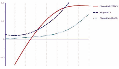 • Dimensión estética: consta de los ítems “bello/feo”, “atractivo/repulsivo” y “admirable/despreciable” y se elaboró mediante una escala de respuesta según la técnica del diferencial semántico en la que los adjetivos se presentan en una estructura bipolar de 7 puntos de valor (+3 a -3).