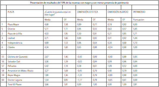 La lectura de la Tabla 1, que muestra las características descriptivas de las escenas analizadas del 10 % de las plazas con mayor presencia de patrimonio edificado y del 10 % de las plazas con menor presencia de “patrimonio edificado”, indica que las plazas con mayor puntuación en patrimonio edificado (plazas numeradas de la 1 a la 6) tienen una valoración estética promedio muy por encima de la media, al igual que ocurre con el ítem “prueba de validez”. En cuanto a la “dimensión agrado”, se observa que todas adquieren valores promedio positivos, salvo la Plaza de la Cibeles (posiblemente debido a la alta contaminación acústica y alto tráfico vehicular). Por el contrario, para el grupo de las plazas con menor puntuación en “patrimonio edificado” (plazas numeradas de la 55 a la 60), los valores están muy por debajo de la media de la muestra, tanto para la “dimensión estética” como para la prueba de validez, salvo en una notable excepción, la plaza de las Peñuelas (probablemente a causa de la alta presencia de árboles y naturaleza, y cuya puntuación en “agrado” es elevada).