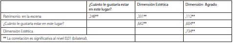Con el fin de contrastar las hipótesis planteadas, se lleva a cabo una primera aproximación mediante la matriz de correlaciones entre la presencia de patrimonio y las respuestas dadas por los participantes a los tres ítems señalados. Los resultados presentados en la Tabla 2, muestran como la presencia de patrimonio en la escena urbana tiene correlaciones significativas de signo positivo, tanto con la prueba de validez como con la percepción de lo bello y con el agrado en la escena, siendo la correlación más alta la de “presencia de patrimonio” y “dimensión estética”. También se observa que los coeficientes de correlación de Pearson muestran una alta conexión entre las tres categorías, llegando a compartir el 54% de la varianza la “dimensión estética” con la “dimensión agrado” (p=0,734).
