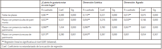 Asimismo, en los modelos lineales de los grupos de plazas clasificados en función de su presencia de patrimonio, los resultados son similares al modelo con la muestra completa (Tabla 3), aunque poseen menor potencia estadística[11]. Para los tres grupos la “presencia de patrimonio” presenta una relación estadísticamente significativa para la “dimensión estética” y para la “prueba de validez”. Únicamente en el grupo de plazas con “escasa presencia” de patrimonio, la presencia de este no influye de forma significativa en la percepción de agrado, aunque sí en la “dimensión estética” y en la proyección de uso de la plaza.