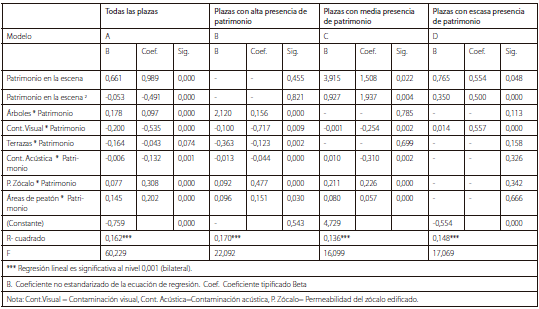 En la Tabla 3 se presentan los resultados de los modelos de regresión con la variable “presencia de patrimonio” como variable criterio y los tres ítems como variables explicadas. Los análisis se realizan para la muestra completa de los 60 casos de estudio (“Todas las plazas”) así como para la muestra dividida en tres grupos de plazas en función de la “presencia de patrimonio” en las escenas a las que se ha denominado “Plazas con alta presencia de patrimonio”, “Plazas con presencia media de patrimonio” y “Plazas con presencia escasa de patrimonio”.