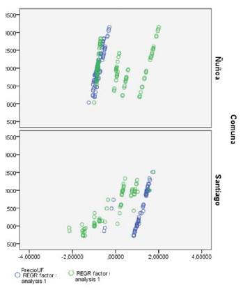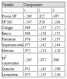 Para identificar la correlación existente entre las variables del estudio, se lleva a cabo un análisis de componentes principales, que revela la distribución de los atributos, donde cada uno de ellos se sedimenta en alguno de los componentes identificados. El componente 1: atributos de ubicación; componente 2: precio en UF; componente 3: tamaños. En el componente 1, se agrupan todas las distancias (a banco, colegio, supermercado, farmacia y metro) y los atributos del proyecto, como quincho, piscina, lavandería y gimnasio. Es aquí donde se comprueba estadísticamente que una mala ubicación es suplida con más atributos de proyecto para la zona en cuestión.