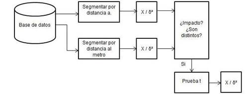Para determinar el efecto de las nuevas estaciones de la línea 3 del metro del Área Metropolitana de Santiago sobre los departamentos nuevos en oferta, se estableció la construcción de una base de datos censal de departamentos vendidos (recolectados en In citi y portalinmobiliario) en el periodo de (2014-2015), una vez que fue anunciada la ubicación de las estaciones. Posteriormente, se analizaron los datos en base a los esquemas expuestos a continuación (Figura 4 y Figura 5), uno descriptivo y uno correlacional, donde se calcula el precio hedónico.