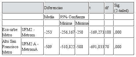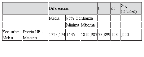 Se encontraron dos grandes grupos de datos y se hizo necesario comparar las medias de cada uno de estos grupos que representan cada uno un proyecto urbano, mediante la prueba de la t de Student. Lo que se busca al realizar esta prueba es que las dos variables no representen lo mismo dentro de la variable dependiente (Precio, Tabla 1). En las siguientes tablas se muestran los resultados de la prueba t: la Tabla 2 ilustra la prueba t con respecto al precio en UF y la Tabla 3, la prueba t con respecto a precio por metro cuadrado. Así, se concluye que los proyectos son estadísticamente distintos, ya que los índice t de ambos casos son diferentes para la distancia al metro en relación al precio en UF y al precio en UF por metro cuadrado. Esto evidencia un efecto espacial del precio ante la cercanía al metro.
