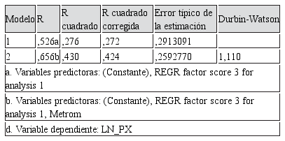 Para la realización de esta regresión múltiple, se utilizaron los valores de puntuación factorial que resumen los efectos de distintas variables autocorrelacionadas, como por ejemplo las variaciones del producto ante cambios de locación. Esta técnica es pertinente ya que, al evitar la multicolinealidad de las variables explicativas y, por ende, al trabajar sobre vectores ortogonales, deja más limpios los efectos de las variables, expresados en los coeficientes.