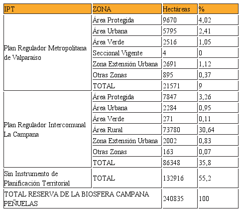 · En la zona núcleo Parque Nacional La Campana existen 3,5 hectáreas de área urbana, localizadas en la comuna de Olmué, mientras que en la zona núcleo Reserva Peñuelas se reconocen 2 hectáreas de ZEUC-4 y 396 hectáreas de áreas rurales. Aun así, la zona núcleo es la de mejor cobertura de normativa, llegando a un 92% de cobertura por IPTs.