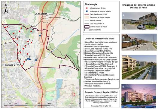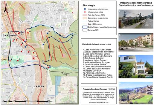 Por una parte, el distrito urbano Hospital de Carabineros, en Las Condes, se muestra como un sector norte con vivienda de alta plusvalía, equipamiento natural (parque) y centros deportivos que, no obstante, debe convivir con infraestructura crítica representada por un centro nuclear y una subestación eléctrica. Por otra parte, el sector sur, con el distrito urbano El Peral, en Puente Alto, ofrece mayor distancia a la franja de ruptura de sus zonas habitacionales, pero cuenta con menor equipamiento urbano que actúe como amortiguador ante una activación de la Falla San Ramón y, aún más complejo, con mayor cantidad de colegios en riesgo, por lo tanto, con una población menor de edad que necesita de mayor contención ante una evacuación.