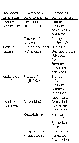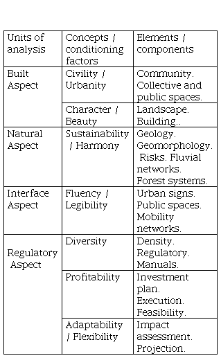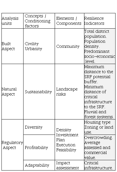 Urban design can build a suitable response strategy for city and town reconstruction, if its core concepts and development stages are considered when building neighborhoods, including the civic attitude of their residents and their cultural practices or assets (Moser, Sou & Stein, 2011). In this line, the “Urban Design Compendium” of the United Kingdom allows obtaining a summary of key actions that should be incorporated in all urban recovery proposals, like promoting spaces for people; integrating the natural and built landscape; providing the urban shape and its mixed uses; managing the investment and production; and designing to provoke changes (English Partnerships & Housing Corporation [EP&HC]. 2007). In a broader overview of these actions, Table 1 connects the analysis units with the classic civic and urban design concepts and elements, to take on a resilient attitude in the inhabited landscape and, from there, to address the foothill region, focus of this research.
