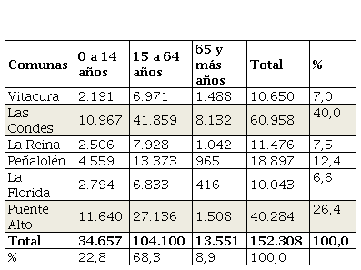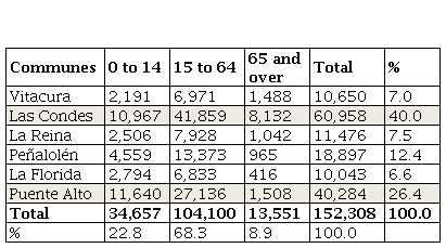 A nivel comunal, se presenta un panorama disímil en el que dos comunas concentran la mayor cantidad de personas (101.242) que representan el 66,4% de total de la población afecta a la faja de ruptura de la Falla San Ramón: Las Condes, con 60.958 habitantes, y Puente Alto, con 40.284 habitantes, cifras que representan el 40,0% y 26,4%, respectivamente. En términos etarios, ambas comunas (Las Condes y Puente Alto) muestran un porcentaje similar de población de menor de 14 años, sin embargo, difieren en cuanto a los grupos mayores de edad, entre 15 y 64 años y 65 y más años, donde Las Condes casi duplica el grupo 15-64 años, con 41.858 habitantes, respecto de Puente Alto (27.136 habitantes).