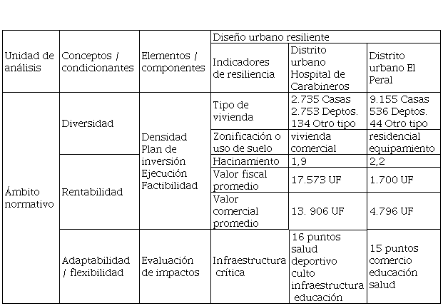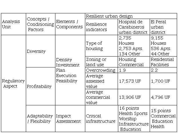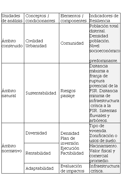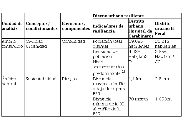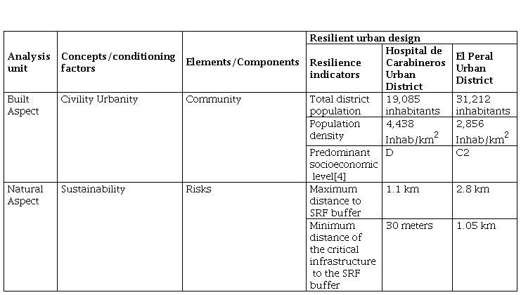 This research considers a mixed approach with quantitative and qualitative methods gathered using an analysis matrix of the urban design elements that includes three areas of action -built, natural and regulatory- that allow identifying critical situations with inhabited sectors, where the resilience response increases or decreases on facing the seismic risk that the San Ramón Fault represents. This analysis matrix, presented as Table 3, also combines the concepts/conditioning factors and the elements/components of the inhabited area of Table 1, as units of analysis, and adds urban quality of life and resilience indicators which have been chosen and reinterpreted from three main sources: 2017 Census (INE, 2017), Chile’s National Urban Development Council (CNDU, 2020), and the collection of data taken from the Fondecyt Regular N° 1190734 project.