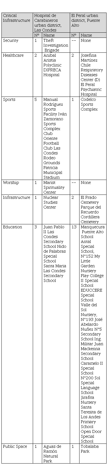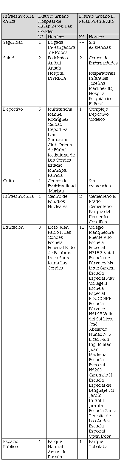 On one hand, the Hospital de Carabineros urban district in Las Condes, is seen as a northern sector with high cost housing, natural facilities (parks) and sports facilities that must however, coexist with critical infrastructure represented by a nuclear center and an electricity substation. On the other hand, the southern sector, with the El Peral urban district in Puente Alto, offers a greater distance from the buffer for its housing areas, but has fewer urban facilities that act as a buffer on facing an activation of the San Ramón Fault, and what is even more complex, is the higher number of schools at risk, meaning a younger population that needs greater contention during an evacuation.