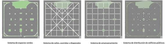 Dentro del casco, se pueden distinguir cuatro elementos morfológicos particulares: el sistema de calles (Figura 2), avenidas y diagonales; el sistema de plazas y espacios verdes; el sistema de amanzanamiento y el sistema de distribución de los edificios públicos (Birche y Jensen, 2018).