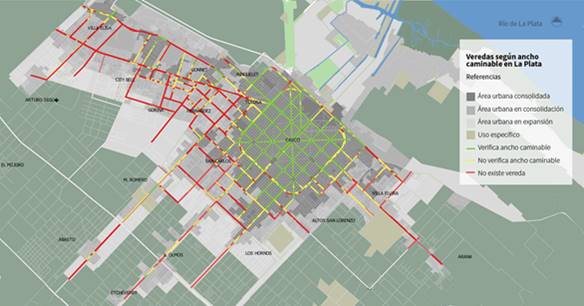 In summary, the use and state of the pedestrian street spaces in La Plata were reviewed, seeing that their design is directed at motorized transport, coherent with the diffuse growth model. It was confirmed that 67.9% of the urban area does not have sidewalks that guarantee accessibility for people, a percentage that is exclusively outside the foundational hub.