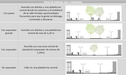 A classification is adopted for the morphological characteristics, based on four street types: those with an esplanade (central platforms with urban furniture and equipment); those with a large separator (central platform of more than 1.2 meters without equipment); those with a small separator (central platform of less than 1.2 meters); and ones without a separator. Meanwhile, the state of the sidewalk is classified into three categories (Figure 5), taking the walkable width established in the Global Street Design Guide (NACTO, 2016)