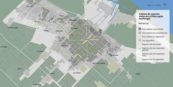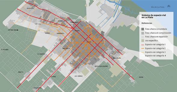 La ciudad de La Plata es un claro ejemplo de cómo la red viaria es el verdadero estructurador del territorio. Como muestra Herce (2008), en un principio la red sólo oficia de nexo entre nodos estratégicos que luego se van jerarquizando y absorbiendo por ocupación de edificaciones dispersas. La dispersión del sistema construido en la ciudad difusa trae consigo la necesidad de transporte de personas, materia y energía al incrementarse las distancias, lo que da como resultado el incremento del uso de medios motores. Siguiendo a Rueda (1997), el modelo difuso induce a un aumento de: 1) dificultades de movilidad: congestión; 2) horas de viaje por distancia: congestión; 3) ocupación del espacio público; 4) inaccesibilidad; 5) emisión de gases a la atmósfera; 6) niveles de ruido superiores a los admisibles; 7) inseguridad y número de accidentes; 8) naturalización de condiciones de circulación y sus efectos; 9) fragmentación de los sistemas naturales; y, 10) Degradación del espacio público. Todos estos aspectos pueden observarse en el caso de La Plata, la cual ha adoptado tempranamente un modelo de crecimiento difuso.