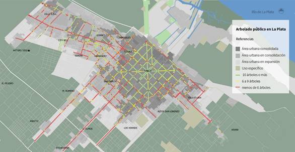 Tras analizar el arbolado público de alineación, se puede advertir que un 51,9% de las vías analizadas no verifican el umbral mínimo de 10 árboles cada 100 metros, y que los tramos con menos de 10 árboles cada 100 metros corresponden exclusivamente a la periferia.