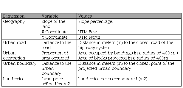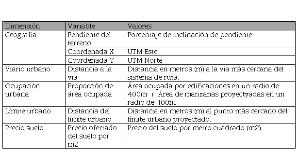 The mapping of the consolidated urban blocks was a semi-manual task of identifying vacant polygons within the proposed urban boundary, developed on the projected blocks of the Metropolitan Development Plan and real color satellite images. The mapping of the peripheries considered a minimum lot size of approximately 100m2, similar to the 107m2 proposed by the FMV (2018c). 9123 blocks were identified with a total of 34.22 km2, which represents 33.12% of all the urban territory considered, which was 103.32 km2. This block definition allowed a characterized comparison of the areas of the satellite image. The main roads were identified based on existing plans in the repository of the Ministry of Transport and indicated in the Metropolitan Development Plan. Likewise, the slopes processed from the curves defined in the national charter were used, which were expressed in percentages. After this, the information was collected from 228 valid lots of a total of 273 calculated for a simple sample, NC=90%, E=5%, p=50%. The observation points were spread randomly on the plain in an amount proportional to the population density shown in the current plan. The characteristics of the observation points that were considered, are detailed in Table 1 and have been used as characteristics to determine the classification of urban areas through a K-Means algorithm, implemented with the scikit-learn library.