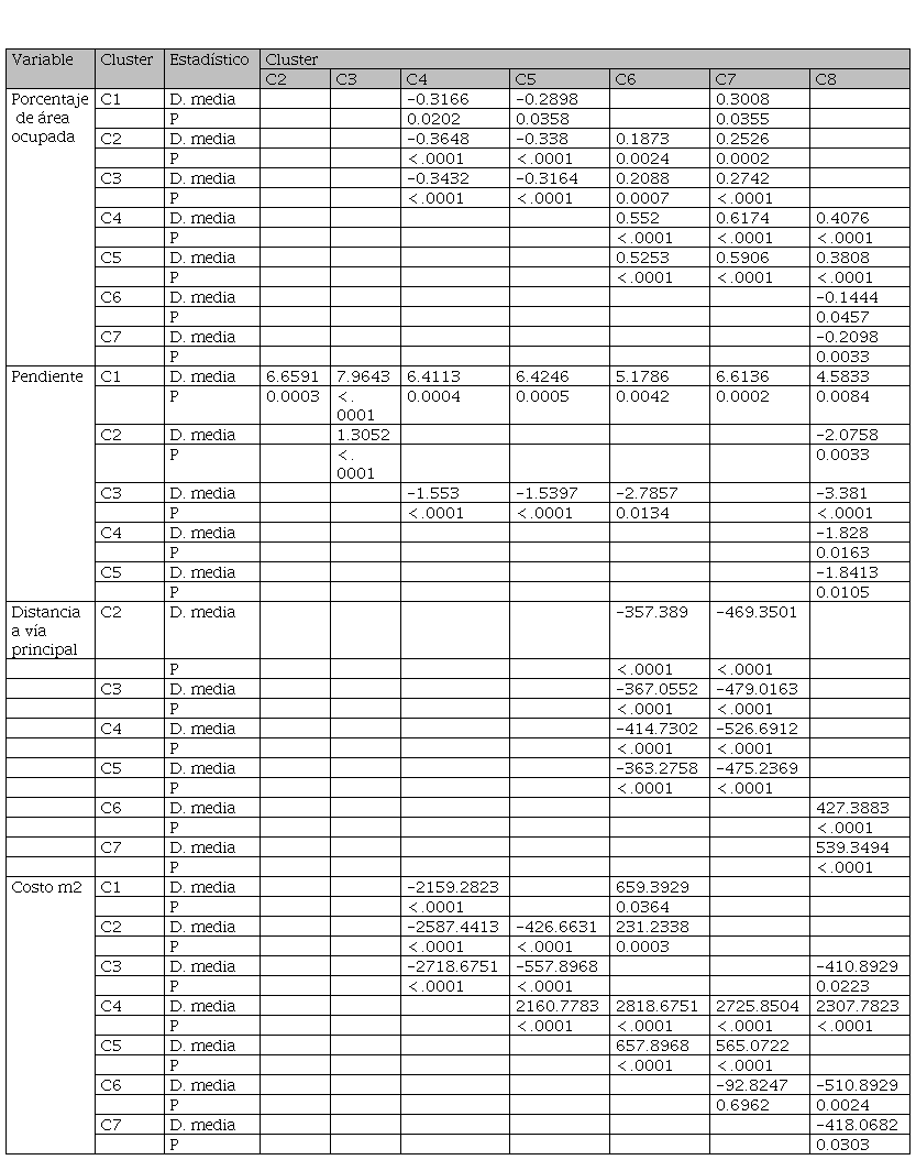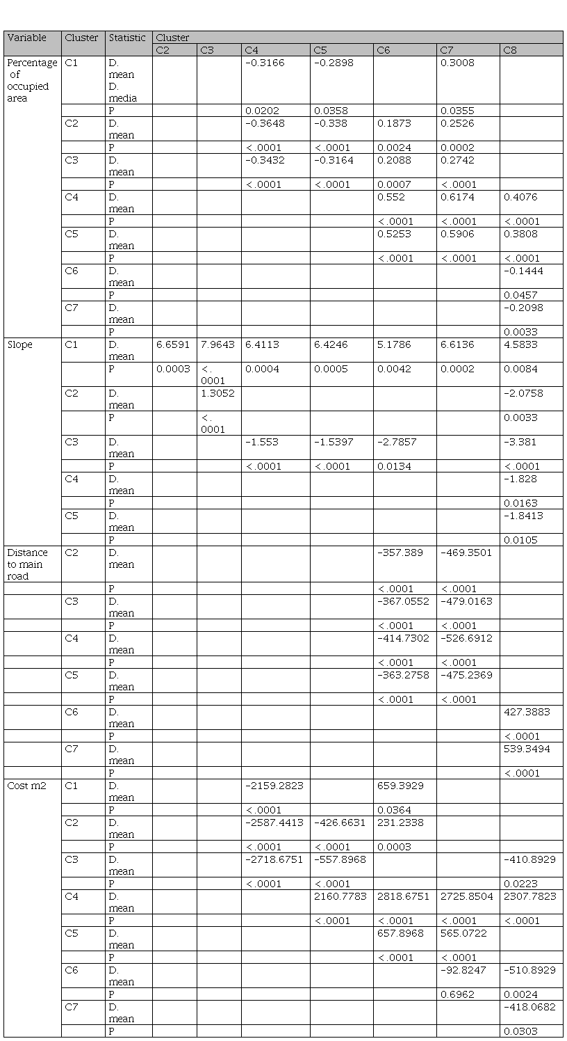 La Tabla 2 permite identificar diferencias significativas entre clústeres emparejados. La proporción de área urbana ocupada es significativamente diferente entre C1 y C4, C5 y C7; entre C2 y el intervalo que va desde C4 a C7; entre C3 y el intervalo que va desde C4 a C7; entre C4 y C6, C7 y C8; entre C5 y C6, C7 y C8; entre C6 y C8; y entre C7 y C8. La pendiente, por su parte, es significativamente diferente entre C1 y el intervalo que va desde C2 a C8; entre C2 y C3 y C8; entre C3 y C4, C5, C6 y C8; entre C4 y C8; y entre C5 y C8. La distancia a la vía principal es significativamente diferente entre C2 y C6 y C7; entre C4 y C6 y C7; entre C5 y C6 y C7; entre C6 y C8; y entre C7 y C8. Por último, el costo por m2 es significativamente diferente entre C1 y C4 y C6; entre C2 y el intervalo desde C4 a C6; entre C3 y C4, C5 y C8; entre C4 y el intervalo desde C5 a C8; entre C5 y C6 y C7; entre C1 y C7 y C8; y entre C7 y C8. En suma, se identificaron diferencias significativas en todas las variables.