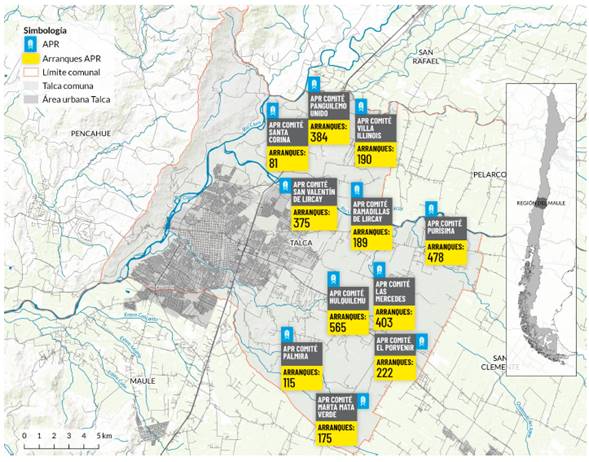 En la Figura 1 se presenta la localización de los comités distintos comités de APR de la comuna de Talca, con la respectiva cantidad de arranques de agua potable rural al año 2017 (i.e. hogares abastecidos). El polígono demarcado por la línea roja representa los límites administrativos de la comuna.