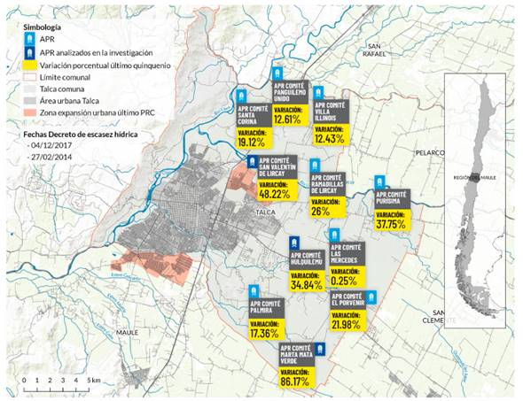 En la Figura 2 se ilustra, en destacado azul, los tres comités seleccionados como estudios de caso. En cada caso se ha reseñado la variación porcentual de la cantidad de hogares abastecidos por cada sistema de agua potable rural entre 2011 y 2017. En color rosado se indica el área de expansión urbana de este mismo período, habilitada por el cambio de Plano Regulador de Talca aprobado en el año 2011. Asimismo, se señalan las fechas de los decretos de zonas de escasez de agua potable, establecidas por la Dirección General de Aguas para las zonas nororiente y sur de la comuna de Talca.