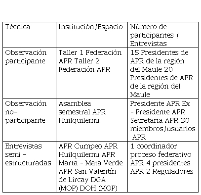 La observación participante consistió en dos talleres para el proceso de constitución de una federación regional de APR en el que concurrieron 20 organizaciones. La observación no participante consistió en la asistencia a una Asamblea del APR Huilquilemu, con la participación de la directiva y 30 socios. En la Tabla 1 se detalla la muestra utilizada.