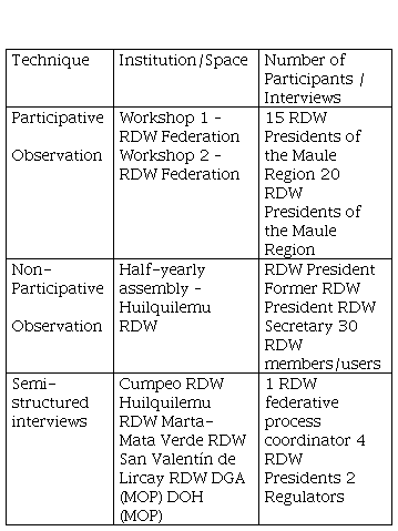 The participative observation consisted of two workshops for the constitution process of a regional RDW federation, to which 20 organizations attended. The non-participative observation consisted in attending an Assembly of the Huilquilemu RDW, with the participation of the board and 30 partners. Table 1 outlines the sample used.