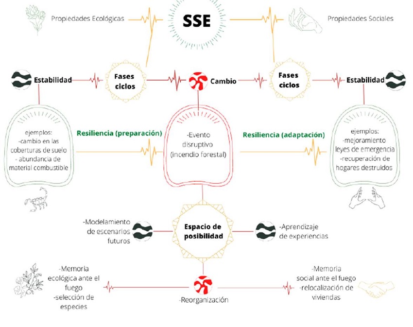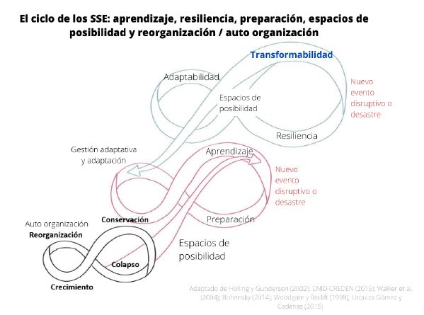 • Ciclos de cambios: son aquellos períodos caracterizados por variables rápidas compuestas por eventos disruptivos que rompen con la estabilidad previa que presentan desafíos a los SSE, ya que les ofrecen espacios de posibilidad para: adaptarse, aprender lecciones, ser resilientes, prepararse, colapsar o transformarse definitivamente. Un ejemplo concreto de ciclo de cambios se da con en los terremotos que, de forma intempestiva, revelan si los SSE poseen bucles de retroalimentación positivos o negativos. Si son positivos, serán capaces de ser resilientes o adaptarse pasando a un nuevo ciclo de estabilidad y manteniendo sus componentes principales en sus sistemas naturales y humanos. En el caso del terremoto, se iniciarán rápidamente las labores de reconstrucción. Si los ciclos de cambio son negativos, albergarán colapsos en ambos sistemas demostrando que no fueron capaces de aprender lecciones y se transformarán en nuevos SSE, cuyos componentes no humanos y humanos no estarán adecuadamente preparados. En el caso del terremoto, la inestabilidad política y social que se exacerba tras el desastre, conducirá a problemas de violencia urbana, contaminación y migración.