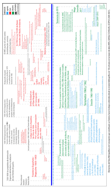 A partir del contexto descrito, el objetivo de este artículo es identificar y analizar de forma exploratoria los ciclos de estabilidad - cambios, así como las variables lentas-rápidas en el paisaje del AMC, utilizando como base teórica los Sistemas Socio Ecológicos o SSE (Hertz, García y Schlüter, 2020). Así también, se propone identificar elementos clave que configuren al AMC como un SSE porque solo se le ha reconocido como área metropolitana desde el urbanismo, y desde la geografía como parte de la cuenca del Biobío y una de las últimas zonas de clima mediterráneo del país. Para ello, se analizó a través de una revisión literaria de 150 artículos de revistas indexadas, en español e inglés, con dos términos clave: “Concepción” y “Área Metropolitana de Concepción”. La hipótesis de trabajo es que los SSE en el AMC están sometidos a rápidos cambios, seguidos de largos ciclos de estabilidad, cuyos conductores lentos son mayormente de origen antrópico y sus conductores rápidos son, en su mayoría, de origen natural; es decir, los paisajes del AMC evolucionarán rápidamente sin una perspectiva SSE que incorpore los conceptos clave de forma sostenible, creando paisajes inestables en sus sistemas naturales y humanos.
