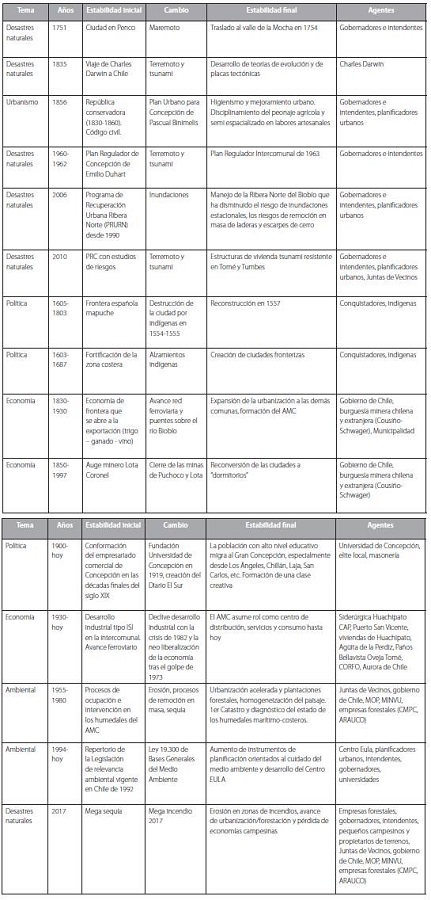 Los artículos analizados expresan una perspectiva antrópica e identifican ciclos de cambios - estabilidad que poseen bucles de retroalimentación muy diferentes a los agentes, leyes y actividades económicas. Esto sucede porque son ciclos de corta duración originados en los sistemas naturales, es decir, eventos catalizadores para los sistemas naturales agrupados en terremotos, maremotos/tsunamis, sequías, incendios forestales, inundaciones y tornados. Como muestra, en 1751 se produjo un evento de cambio ocasionado por un maremoto que rompió con la estabilidad previa de la ciudad en Penco, por lo que cuando la tierra dejó de temblar permitió a los sistemas humanos el traslado de la población al Valle de la Mocha en 1754 (Salinas y Baeriswyl, 2017) (Tabla 1).
