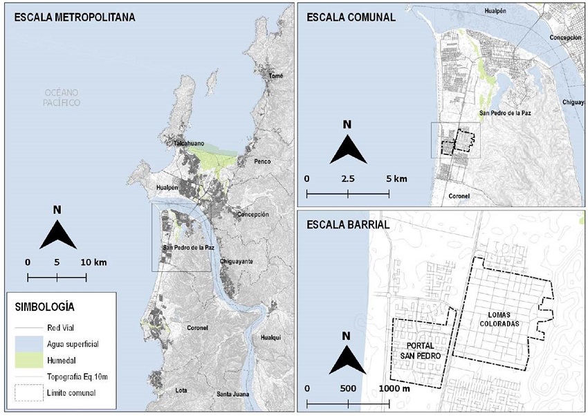 San Pedro de la Paz es una comuna de la provincia de Concepción ubicada en el borde costero de la Región del Bío-Bío (Figura 1). Desde la geografía física, sus unidades principales son: Océano Pacífico, río Bío-Bío, planicie litoral, Cordillera de Nahuelbuta, Humedal Los Batros y las lagunas Grande, Chica y La Posada. Estas unidades geográficas y morfológicas han sido influyentes en los procesos de asentamiento, configuración y crecimiento de sus núcleos urbanos (Salinas & Pérez, 2014). De esta forma, el crecimiento urbano se ha desarrollado de manera fragmentada, sin un centro espacial ni funcional.