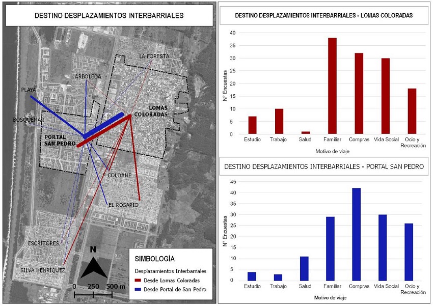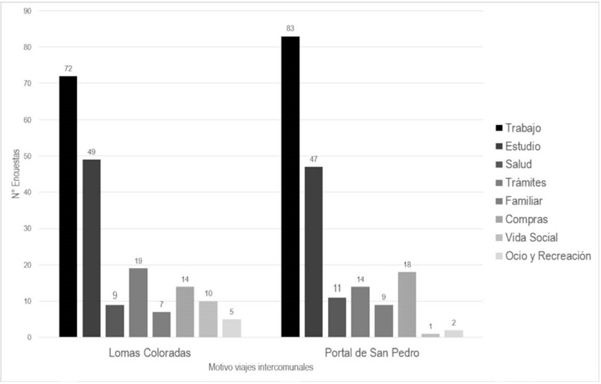 Los motivos de viaje interbarriales coinciden en ambos sectores periurbanos de integración local distinta, salvo en los motivos ocupacionales de salud y trabajo. Esto se explica porque el único equipamiento asistencial se encuentra en Lomas Coloradas (Figura 2) y porque parte de la población encuestada residía en Lomas Coloradas, pero trabajaba en Portal San Pedro. En otro aspecto, los resultados varían en cuanto al destino del desplazamiento, donde el sector con menor densidad poblacional muestra una mayor dispersión de desplazamientos fuera de su barrio de origen, es decir que a mayor densidad, se da un mayor uso del barrio inmediato (Figura 10).