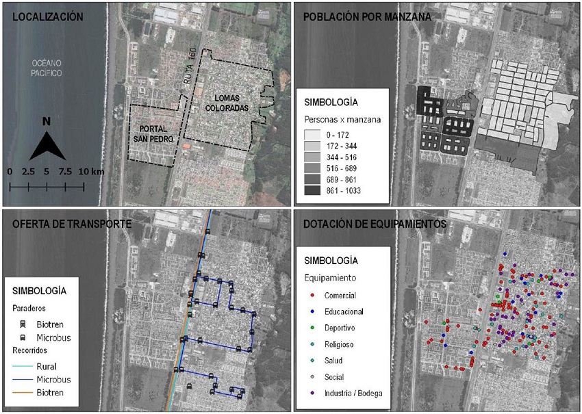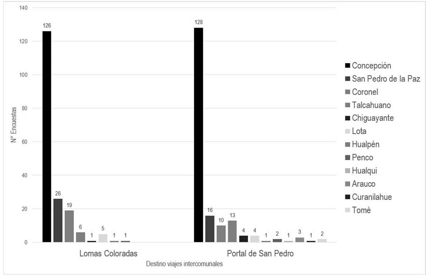 ABSTRACT: The aim of this article is to comprehend daily mobility practices in contiguous peri-urban residential areas that have different characteristics in terms of their historical origin, urban design and layout, socioeconomic level, and access to public transportation, using the areas of Lomas Coloradas and Portal de San Pedro in the commune of San Pedro de la Paz. From a quantitative analysis, the level of integration allowed by the urban fabric was analyzed comparatively using the Space Syntax method (Hillier et al., 1987) through the depthMapX software, to then identify the number of facilities and population density based on data from the 2017 census. Finally, mobility was studied by applying semi-structured surveys focused on supply. The results show that the type of urban fabric and its level of local integration lose importance in daily mobility practices when it comes to intercommunal travel. Thus, within the transport offer, just satisfying access to these areas does not ensure the reduction of the urban inequality observed in the daily mobility of people.