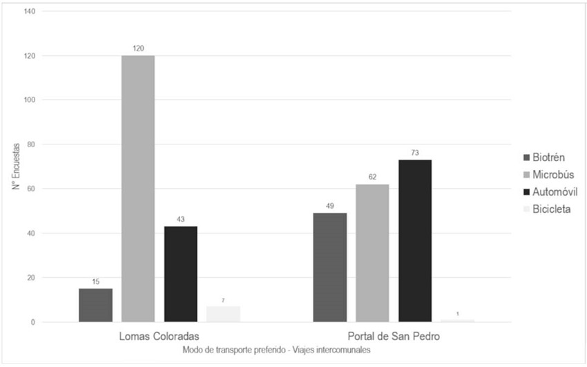Respecto de la puntualidad, incide el modo utilizado en los viajes pendulares; los microbuses diariamente se ven afectados por atochamientos, mientras Biotrén opera con una frecuencia de salida cada 15 minutos. Un 37% de las encuestas evalúa la seguridad como mala y 45% como regular, cifra que en Portal San Pedro aumenta un 47% de mala y a un 39% de regular. Por lo tanto, el transporte público en el barrio con mejor puntualidad es percibido como más inseguro, coincidiendo con un mayor gasto en transporte (24,8% sobre $50.000) y predominancia del automóvil. Por otro lado, el sector con mejor cobertura de transporte público es percibido como más seguro, independiente de la variable puntualidad. Este último caso, corresponde al sector Lomas Coloradas y coincide con el uso del microbús en un 65% de las encuestas para el motivo ocupacional, con un menor gasto en transporte.