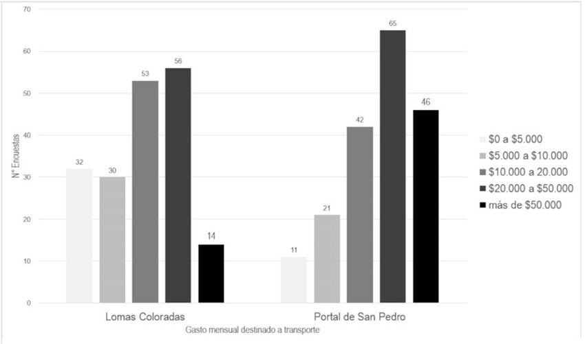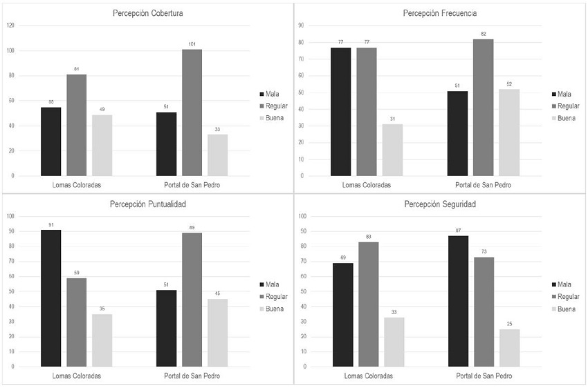 Para las variables de cobertura y frecuencia, ambos sectores difieren en el acceso a transporte público a distancias caminables. Si bien los datos indican que para Lomas Coloradas la percepción de acceso a transporte público a distancia caminable es peor que Portal San Pedro (30% y 27% respectivamente), la frecuencia resulta mejor valorada para este último caso (28% mala para Portal San Pedro, 41% mala para Lomas Coloradas).