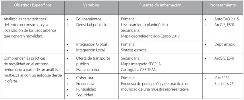 En un primer nivel de análisis, en primer lugar, para estudiar la estructura urbana, se consideró el cálculo de los niveles de integración global y local de la trama urbana realizando un levantamiento planimétrico en AutoCAD 2015. En segundo lugar para procesar la relación entre cada segmento, se utilizó el software DepthmapX (Figueroa et al., 2018). Finalmente, para profundizar la comprensión a nivel espacial, se complementó lo anterior con el levantamiento de equipamientos, densidad poblacional y habitacional (tabla 1). En un segundo nivel de análisis, a fin de comprender las prácticas de movilidad, se observaron las variables que Herce (2009) propone desde la oferta, a saber: cobertura, seguridad, frecuencia y puntualidad, lo cual fue complementado con levantamientos cartográficos de la oferta de transporte. Para ello, se realizaron 370 encuestas de origen-destino y semiestructuradas, a residentes mediante un sistema puerta a puerta durante los meses de febrero y marzo 2019, con un 95% de confiabilidad y un error muestral de 5%, las que luego fueron procesadas con estadísticos descriptivos de SPSS. La población objetivo fue de 9.964 personas y se definió de acuerdo con la sumatoria de los habitantes de cada manzana en ambos casos de estudio, según datos georreferenciados del Censo 2017. Para el cálculo de la muestra se trabajó con la siguiente expresión (Suárez, 2004):