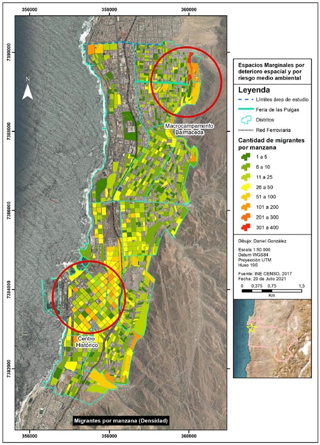 En la ciudad de Antofagasta se confirma la aseveración más recurrente de los estudios migratorios, la cual señala que los migrantes van ocupando las áreas desvalorizadas y deterioradas del espacio urbano. Así se identifica el Centro Histórico con un promedio de 100 migrantes por manzana viviendo en situación de subarriendo de piezas o conventillo. Por otro lado, hacia el norte en la periferia se reconoce el macrocampamento Balmaceda con una mayor cantidad de migrantes, superando en promedio los 300 habitantes por manzana (Figura 3). Estos espacios marginales (en adelante, EM) han sido denominados respectivamente: EM por Deterioro Espacial y EM por Riesgo Medioambiental que serán visualizadas según las variables políticas y espaciales propuesta por Wacquant.